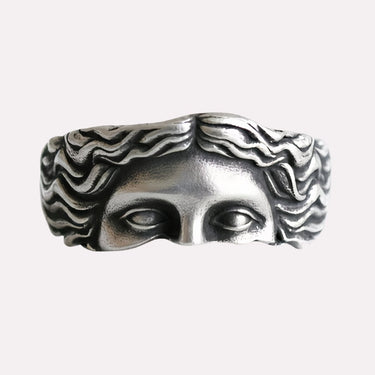 Zainspirowany Afrodytą, grecką boginią miłości, piękna i pożądania, ten pierścień oddaje boską esencję uroku i wdzięku. Jego rzeźbiona forma przedstawia falujące włosy i spokojne spojrzenie, odzwierciedlając ponadczasową grację bogini i jej moc oczarowania każdego, kto ją ujrzy.