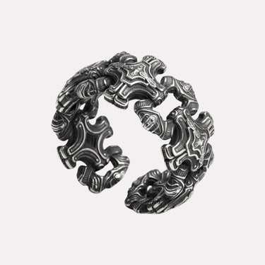 Wkrocz w przepych Cesarstwa Bizantyjskiego z tym misternie wykonanym pierścieniem, kutym z wysokiej jakości stopu metali szlachetnych. Jego złożony, przeplatający się wzór przywodzi na myśl bogato zdobione motywy sztuki i architektury bizantyjskiej – symbol siły, oddania i ponadczasowego piękna.