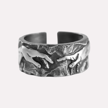 Inspirowany arcydziełem Michała Anioła na sklepieniu Kaplicy Sykstyńskiej, ten pierścień uchwyca jeden z najbardziej ikonicznych obrazów w historii sztuki – moment boskiego stworzenia. Dwie dłonie, wyrzeźbione w wyrazistej płaskorzeźbie, sięgają ku sobie ponad fakturowaną obrączką, symbolizując iskrę życia, więź między śmiertelnym a boskim oraz wieczne ludzkie dążenie do połączenia.